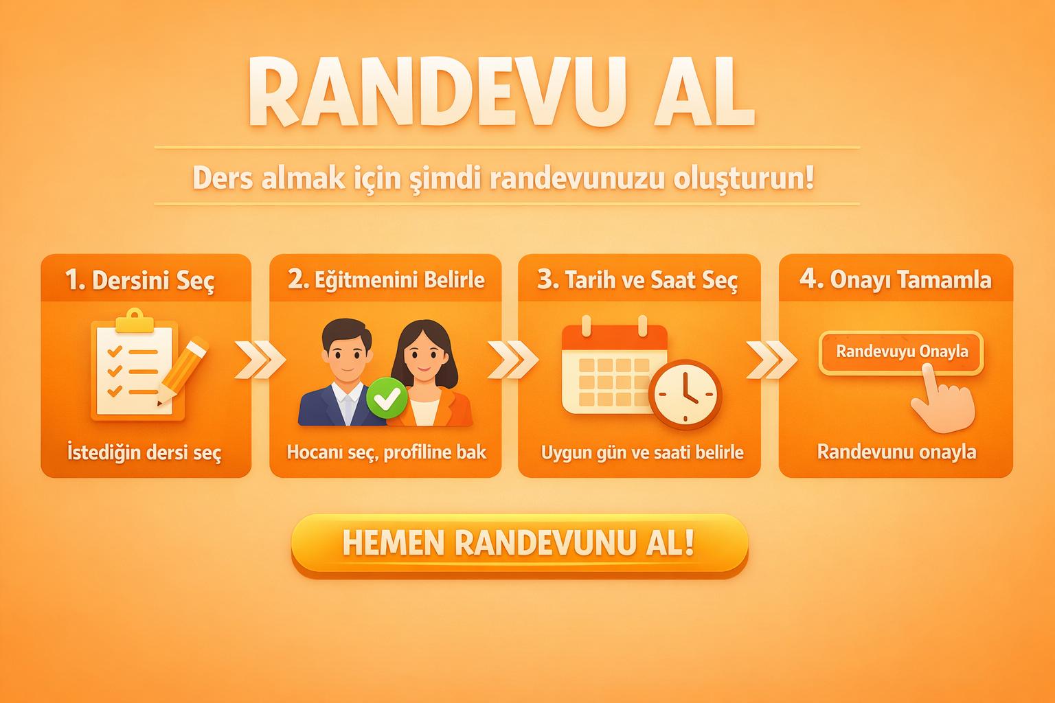 Sana en uygun hocayı bulana kadar vakit ve nakit kaybetmene gerek yok. Sistemimizi ücretsiz deneyerek kalitemizden emin ol ve başarının her adımında dizinin dibinde olacağımız bu yolculuğa güvenle başla